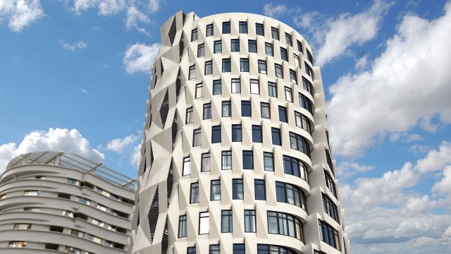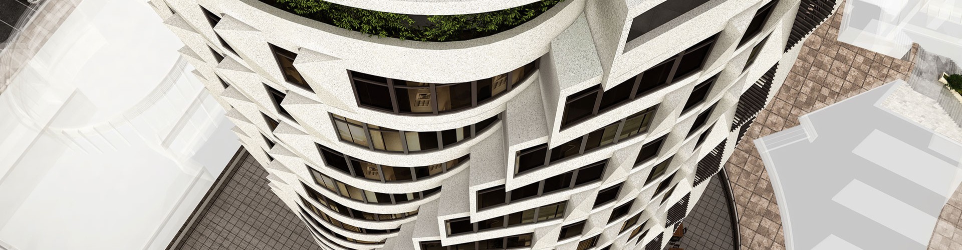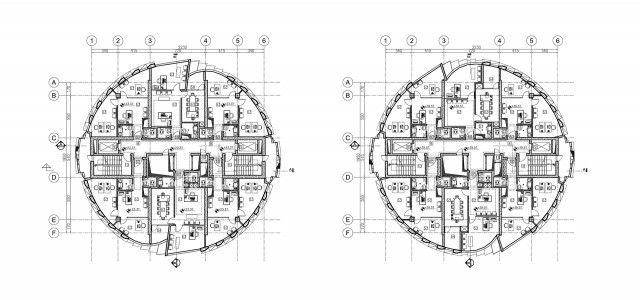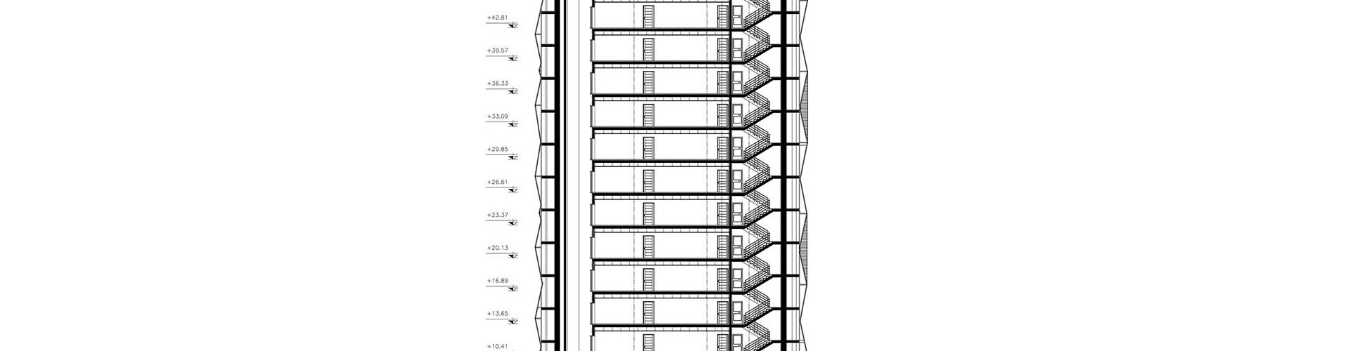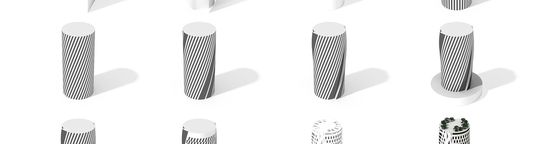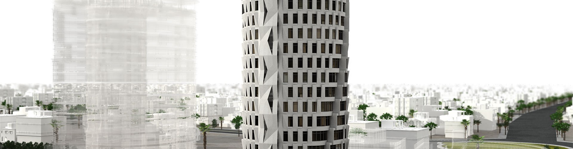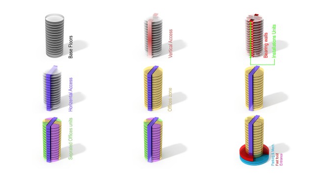 In order to coordinate with neighbor residential towers form, the plan of complex was designed from hexagonal to circle form. Blank form cylindrical covered with transparent glass panels and modular GRC has been reached to the final form that Space behind the staircase in the outer wall of the tower, is planned to put the equipment installation. Covering this space is such that to hide-out equipment and is provided that supply airflow and air circulation.