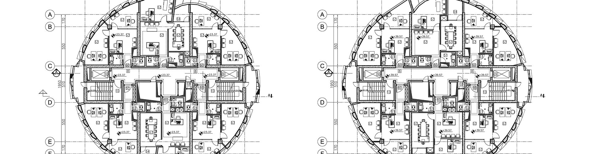 Interior design of office unites such that the central space of the tower dedicated to service and facilities zone to be provided the maximum use of the height of the floor in office spaces.